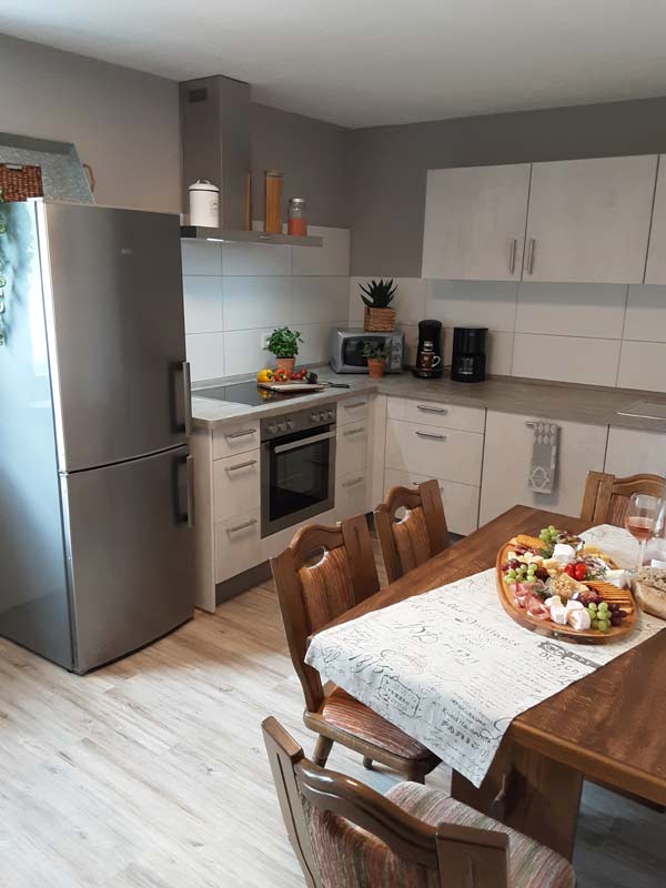 Die 2021 neu erstellte große Ferienwohnung im Obergeschoss, auf einer ganzen Etage, liegt in ruhiger und sonniger Ortsrandlage.